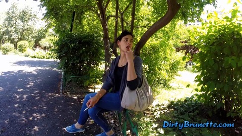 She is with her husband in a park. I dare her to touch her cunt and play with herself right there. She lights a cigarette, sits down and touches herself trough jeans. DB135